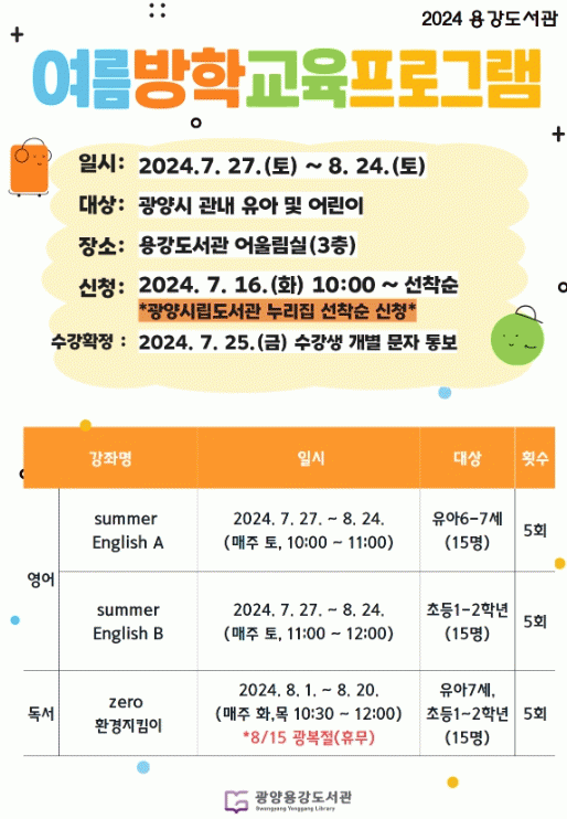 À̹ø ÇÁ·Î±×·¥Àº ±¤¾ç½Ã ¾î¸°ÀÌ(À¯¾Æ 6 ºÎÅÍ 7¼¼) 15¸í, ÃʵîÇлý(1 ºÎÅÍ 2Çгâ) 30¸íÀ» ´ë»óÀ¸·Î Çϸç 7¿ù 27ÀϺÎÅÍ 8¿ù 24ÀϱîÁö ÁøÇàµÈ´Ù.