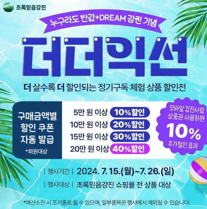 ÃʷϹÏÀ½°Áø ȸ¿øÀ̶ó¸é Á¤±â±¸µ¶ üÇè¿ë ÄíÆùÀÌ Áö±ÞµÇ¸ç, 5¸¸¿ø ÀÌ»ó ±¸¸Å ½Ã 10%, 10¸¸¿ø ÀÌ»ó ±¸¸Å ½Ã 20%, 15¸¸¿ø ÀÌ»ó ±¸¸Å ½Ã 30%, 20¸¸¿ø ÀÌ»ó ±¸¸Å ½Ã 40% ÇÒÀÎÀÌ Àû¿ëµÈ´Ù.