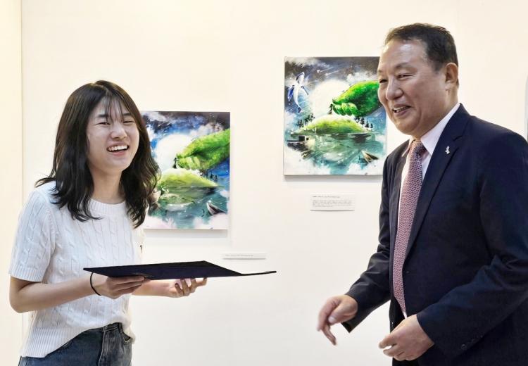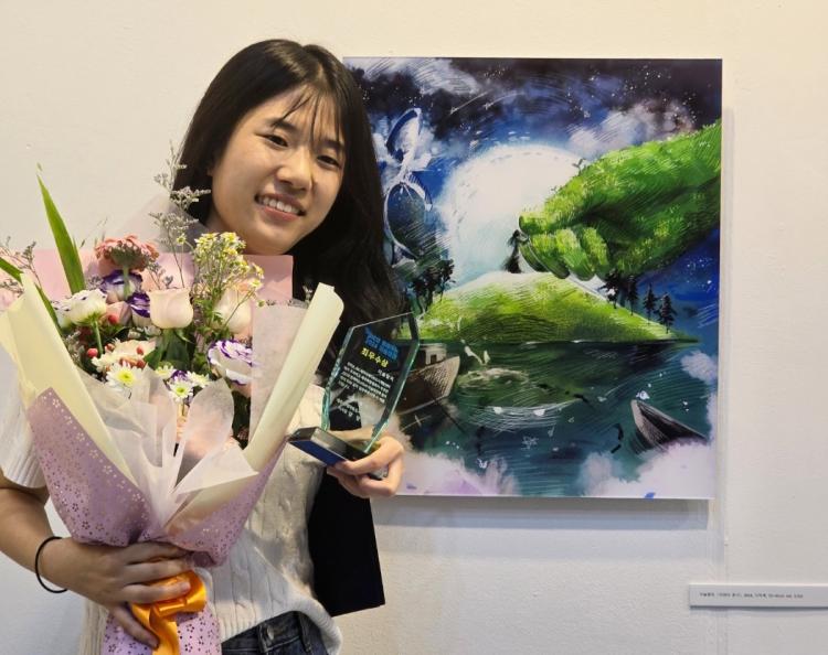ÃÖ¿ì¼ö»óÀ» ¼ö»óÇÑ À̼ú¶÷¹Ì ÇлýÀº ¡°»ç¶÷µéÀÌ ÀÚ¿¬À» ¿¬»óÇÒ¶§ ½£À̳ª ¹Ù´Ùó·³ ½Ã¿øÇÏ´Ù´Â ÀνÄÀ» °®°í ÃÊ·Ï»ö°ú ÆÄ¶õ»öÀ» ¶°¿Ã¸®´Âµ¥, ¡®ÀÚ¿¬ÀÇ ¿Â±â¡¯ÀÛǰÀº ±× Æí°ßÀÇ Æ²À» ±ú°í Ãʷϰú ÆÄ¶û»öÀ» ÅëÇØ Àΰ£°ú ÀÚ¿¬ÀÇ ÈÇÕÀ» ÅëÇØ µû½ºÇÔÀ» Ç¥ÇöÇß´Ù¡±¸ç ¡°Á¦ÁÖµµ »ç¶÷(Àΰ£)ÀÇ ¼ÕÀÌ ÀÚ¿¬°ú ¸Â´ê¾Æ ºûÀÌ È¯ÇÏ°Ô ÆÛÁ®°¡´Â ¸ð½ÀÀº ±Ã±ØÀûÀ¸·Î ÆòÈ¿Í »ó»ýÀ» ÀǹÌÇÑ´Ù.¡±°í ÀÛǰÀ» ¼³¸íÇß´Ù.
