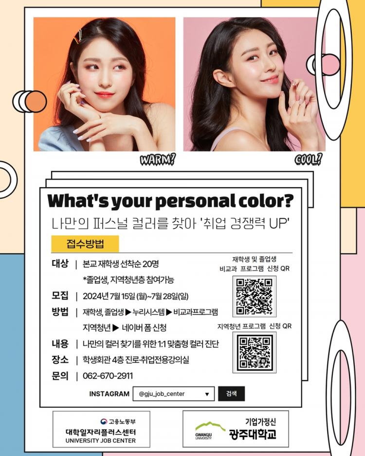 ¿À´Â 30ÀÏ ±¤ÁÖ´ë Çлýȸ°ü 4Ãþ Áø·Î¡¤Ãë¾÷Àü¿ë°Àǽǿ¡¼ ¿¸®´Â ¡®³ª¸¸ÀÇ ÆÛ½º³Î Ä÷¯¸¦ ã¾Æ' ÇÁ·Î±×·¥Àº ¡ãÆÛ½º³Î Ä÷¯ÀÇ È°¿ë¹ý ¡ãWarm°ú Cool ±¸ºÐ°ú Áø´Ü ¡ã4°èÀý ±¸ºÐ°ú 4°èÀýÅæ(Tone) ¡ã1:1 ¸ÂÃãÇü Ä÷¯ Áø´ÜÀ» ½Ç½ÃÇÑ´Ù.