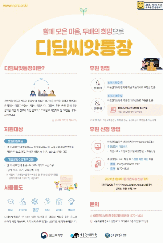 ¿ÃÇØºÎÅÍ µðµõ¾¾¾ÑÅëÀå °¡ÀÔ ¿¬·ÉÀÌ ´çÃÊ ¸¸ 12~17¼¼¿¡¼ ¸¸ 0~17¼¼·Î È®´ëµÇ°í, ¼Òµæ ±âÁصµ »ý°è¡¤ÀÇ·á±Þ¿© ¼öÁØ¿¡¼ ÁÖ°Å¡¤±³À° ±Þ¿© ´ë»ó±îÁö ´ëÆø È®´ëµÆ´Ù. ÀÌ¿¡ ȼø±ºÀº ¹Ì°¡ÀÔ ¾Æµ¿À» ´ë»óÀ¸·Î °³º° ¾È³»¹® ¹ß¼Û µî Áö¼ÓÀûÀÎ È«º¸¸¦ ÅëÇØ °¡ÀÔÀ» µ¶·ÁÇÒ ¿¹Á¤ÀÌ´Ù.