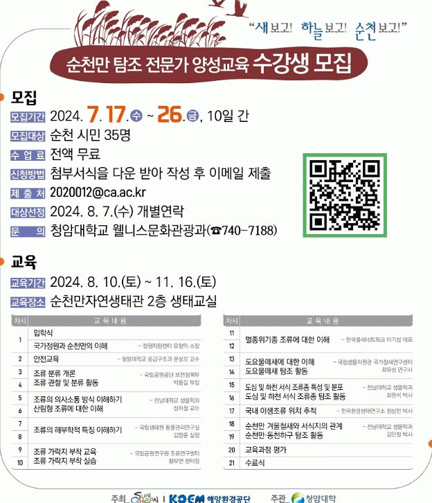 ¸ðÁý´ë»óÀº ¼øÃµ °ü³» °ÅÁÖÇÏ°í »õ¿¡ °ü½É ÀÖ´Â 19¼¼ ÀÌ»ó ¼ºÀÎÀÌ¸é ´©±¸³ª Áö¿øÇÒ ¼ö ÀÖ´Ù. ½Åû¹æ¹ý ¹× ¼¼ºÎ»çÇ×Àº ¼øÃµ¸¸½ÀÁö ´©¸®Áý °øÁö»çÇ׿¡¼ È®ÀÎÇÒ ¼ö ÀÖÀ¸¸ç, ¸ðµç ±³À° °úÁ¤Àº ¹«·á·Î ÁøÇàµÈ´Ù.
