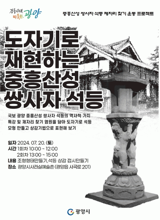 ÃÑ 100¸í(30°¡Á·)ÀÌ ÇÁ·Î±×·¥¿¡ Âü¿©Çϸç, ±¹º¸ ±¤¾ç ÁßÈï»ê¼º ½Ö»çÀÚ ¼®µîÀÇ ¿ª»çÀû °¡Ä¡¿¡ ´ëÇÑ Æ¯° ¼ö°, ¼®µî ¸¸µé±â üÇèÀ¸·Î ¹®ÈÀ¯»êÀÇ ¼ÒÁßÇÔ°ú °¡Ä¡¸¦ ±ú´Ý´Â °Ô À̹ø ÇÁ·Î±×·¥ÀÇ ¸ñÀûÀÌ´Ù.