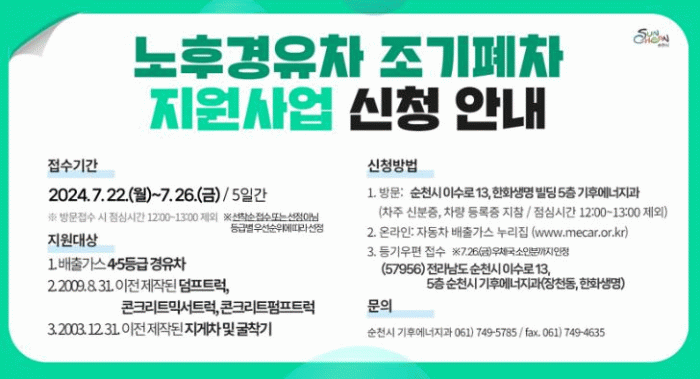½ÅûÀ» Èñ¸ÁÇÏ´Â Â÷·® ¼ÒÀ¯ÀÚ´Â 7¿ù 22ÀϺÎÅÍ 7¿ù 26ÀϱîÁö ¹æ¹®, ÀÎÅͳÝ(ÀÚµ¿Â÷ ¹èÃâ°¡½º ´©¸®Áý, µî±â¿ìÆí µîÀ¸·Î ½Åû °¡´ÉÇϸç, ±âŸ Áö¿øÁ¶°Ç ¹× ÀÚ¼¼ÇÑ »çÇ×Àº ¼øÃµ½Ã ´©¸®Áý °í½Ã/°ø°í °Ô½ÃÆÇ¿¡¼ °ø°í¹®À» È®ÀÎÇÏ¸é µÈ´Ù.