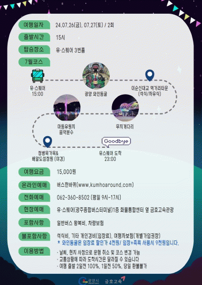 Âü°¡ ½ÅûÀº ±¤¾ç½Ã ¹®È°ü±¤ ȨÆäÀÌÁö ¹× ³²µµÇѹÙÄû ȨÆäÀÌÁö ½ÃƼÅõ¾î ÄÚ³Ê ¡®±¤¾ç¿©Çà °¡´Â ³¯¡¯ ¶Ç´Â À¯¼±À¸·Î »çÀü ¿¹¾àÀÌ °¡´ÉÇÏ´Ù. ÀÌ¿ë¿ä±ÝÀº 1¸¸5õ ¿øÀÌ¸ç ½Äºñ, ÀÔÀå·á, ¿©ÇàÀÚº¸Çè µîÀº Æ÷ÇÔµÇÁö ¾Ê´Â´Ù.