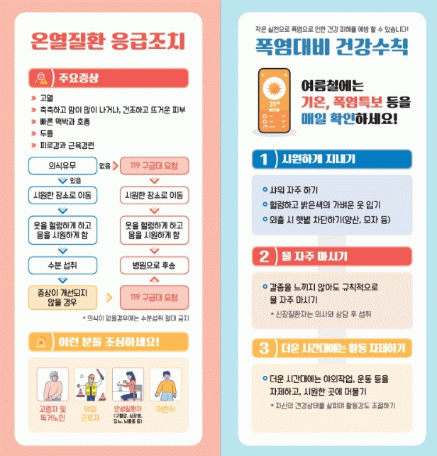 º¸°Ç¼Ò °ü°èÀÚ´Â ¡°Æø¿°Æ¯º¸°¡ ¹ßÈ¿µÇ´Â µî ¹«´õÀ§°¡ Áö¼ÓµÇ´Â °¡¿îµ¥ ³· µ¿¾È ¾ß¿ÜȰµ¿À̳ª ¿îµ¿À» ÀÚÁ¦Çϰí, ¹°À» ÀÚÁÖ ¸¶½Ã¸ç, ¹«´õÀ§ ½°ÅÍ·Î ÁöÁ¤µÈ °ü³» °æ·Î´ç, º¹Áöȸ°ü¿¡¼ ½Ã¿øÇÏ°Ô Áö³»±â¸¦ ½ÇõÇÏ¿© ¿Â¿ÁúȯÀ» ¿¹¹æÇÏ½Ã±æ ¹Ù¶õ´Ù¸ç ¾Æ¿ï·¯ À帶ö ½ÄÁßµ¶ ¿¹¹æÀ» À§ÇØ À½½ÄÀ» À§»ýÀûÀ¸·Î º¸°üÇϰí ÀÍÇô¸Ô´Â °ÍÀÌ ¾ÈÀüÇÏ´Ù¡±°í ¸»Çß´Ù.