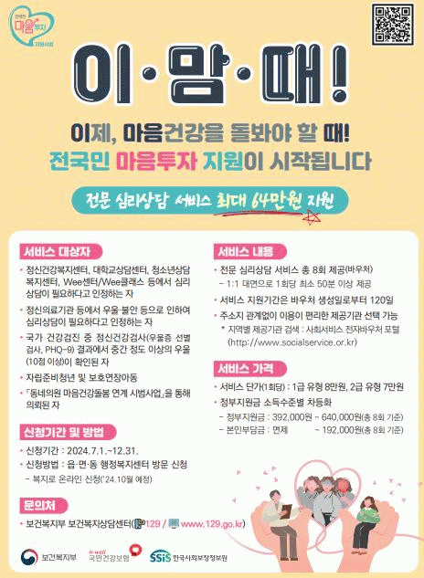 ½ÅûÀ» Èñ¸ÁÇÏ´Â ÀÚ´Â À¾/¸é/µ¿ ÇàÁ¤º¹Áö¼¾ÅÍ¿¡ ¹æ¹®ÇÏ¿© ½ÅûÇÒ ¼ö ÀÖ°í Áö¿ø ´ë»óÀÚ·Î ¼±Á¤µÇ¸é 120ÀÏ µ¿¾È ÃÑ 8ȸÀÇ 1´ë1 ´ë¸é Àü¹® ½É¸®»ó´ã ¼ºñ½º¸¦ ÀÌ¿ëÇÒ ¼ö ÀÖ´Â ¹Ù¿ìó(ÀÌ¿ë±Ç)°¡ Á¦°øµÈ´Ù.