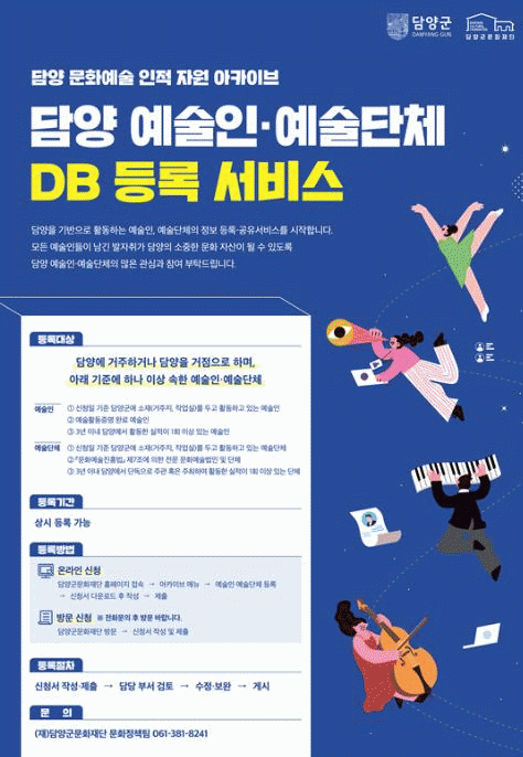 DB µî·ÏÀÌ ¿Ï·áµÈ ¿¹¼úÀÎÀº ÀÚ½ÅÀÇ ¹®È¿¹¼ú Ȱµ¿À» °øÀ¯ÇØ ÀÌ¿ëÀڵ鿡°Ô È«º¸ÇÒ ¼ö ÀÖÀ¸¸ç, ´ã¾ç±º¹®ÈÀç´Ü¿¡¼ ÃßÁøÇÏ´Â »ç¾÷¿¡ ´ëÇÑ Á¤º¸¸¦ ¹ÞÀ» ¼ö ÀÖ´Ù.
