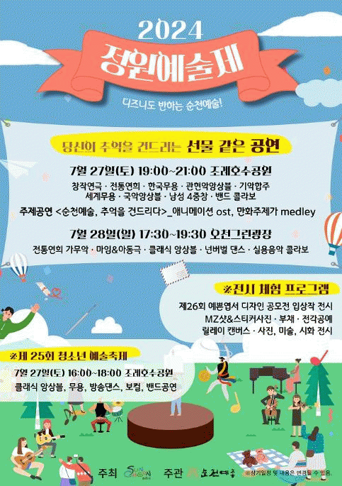 ´õºÒ¾î, Á¤¿ø¿¹¼úÁ¦¿Í ¿¬°èÇÏ¿© Á¦25ȸ ¼øÃµÃ»¼Ò³â¿¹¼úÃàÁ¦°¡ 27ÀÏ 16½Ã Á¶·ÊÈ£¼ö°ø¿ø °ø¿¬Àå¿¡¼ ÁøÇàµÇ¸ç, Á¦26ȸ ¿¹»Û¿±¼ µðÀÚÀÎ °ø¸ð ÀÔ»óÀÛ Àü½Ãµµ 27ÀϺÎÅÍ 28ÀÏ ÀÌÆ² µ¿¾È ¿¸°´Ù.