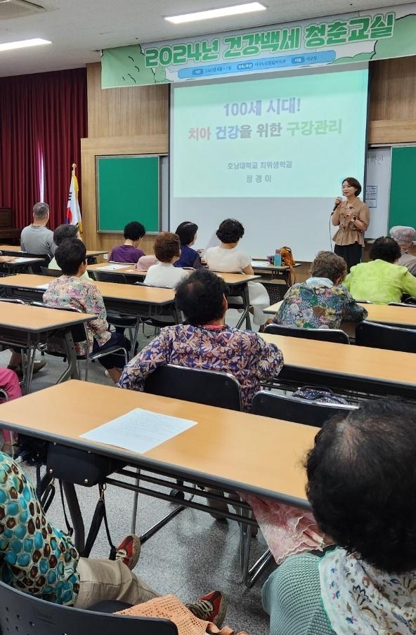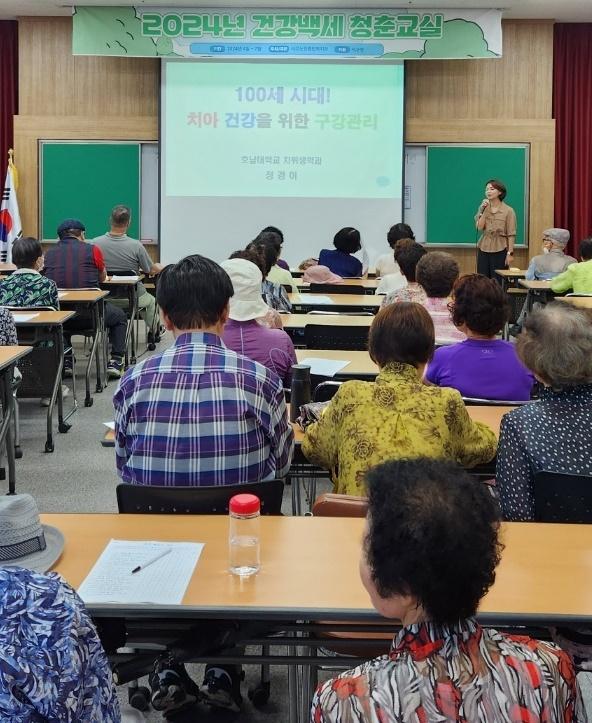 [ÅåÅå´º½º]È£³²´ëÇб³ Ä¡À§»ýÇаú Á¤°æÀÌ ±³¼ö´Â 7¿ù 25ÀÏ ±¤ÁÖ ¼±¸³ëÀÎÁ¾ÇÕº¹Áö°ü¿¡¼ ¡®°Ç°¹é¼¼ ûÃá±³½Ç °Ç°°Á¡¯¸¦ ¼ö°ÇÏ´Â ¾î¸£½Å 50¸íÀ» ´ë»óÀ¸·Î ¡®100¼¼ ½Ã´ë! Ä¡¾Æ °Ç°À» À§ÇÑ ±¸°°ü¸®¡¯¶ó´Â ÁÖÁ¦·Î ±¸°º¸°Ç±³À°À» ½Ç½ÃÇß´Ù.