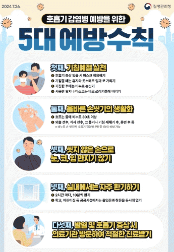 È£Èí±â °¨¿°º´À» ¿¹¹æÇϱâ À§Çؼ´Â ¡ã±âħ ¿¹Àý ½Çõ(±âħÇÒ ¶§¿¡´Â ¿Ê¼Ò¸Å·Î °¡¸®±â), ¡ã¿Ã¹Ù¸¥ ¼Õ ¾Ä±â(È帣´Â ¹°¿¡ ºñ´©·Î 30ÃÊÀÌ»ó ¾Ä±â), ¡ã¾ÄÁö ¾ÊÀº ¼ÕÀ¸·Î ´«¡¤ÄÚ¡¤ÀÔ ¸¸ÁöÁö ¾Ê±â, ¡ã½Ç³»¿¡¼´Â ÀÚÁÖ È¯±âÇϱâ(2½Ã°£¸¶´Ù 10ºÐ¾¿ ȯ±â), ¡ã¹ß¿ ¹× È£Èí±â Áõ»ó ½Ã ¹Ù·Î ÀÇ·á±â°ü ¹æ¹®Çϱ⠵î 5´ë ¿¹¹æ¼öÄ¢À» ÁؼöÇØ¾ß ÇÑ´Ù.