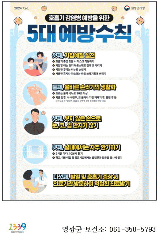 º¸°Ç¼Ò °ü°èÀÚ´Â ¡°È£Èí±â °¨¿°º´ ¿¹¹æÀ» À§ÇØ ±âħÇÒ ¶§ ÈÞÁö³ª ¿Ê¼Ò¸Å·Î ÀÔ°ú ÄÚ¸¦ °¡¸®°í ±âħÇÏ´Â ±âħ¿¹Àý°ú, ¿Ã¹Ù¸¥ ¼Õ¾Ä±â »ýȰÈ, ¾ÄÁö ¾Ê´Â ¼ÕÀ¸·Î ´«, ÄÚ, ÀÔ ¸¸ÁöÁö ¾Ê±â, ½Ç³»¿¡¼ ÀÚÁÖ È¯±âÇϱâ, ¹ß¿ ¹× È£Èí±â Áõ»óÀÌ ÀÖÀ» ½Ã ÀÇ·á±â°ü ¹æ¹®ÇÏ¿© ÀûÀýÇÑ Áø·á ¹Þ±â µî ¿¹¹æ¼öÄ¢ÁؼöÀÇ »ýȰȸ¦ ´çºÎÇÑ´Ù°í ¡±°í ¹àÇû´Ù.