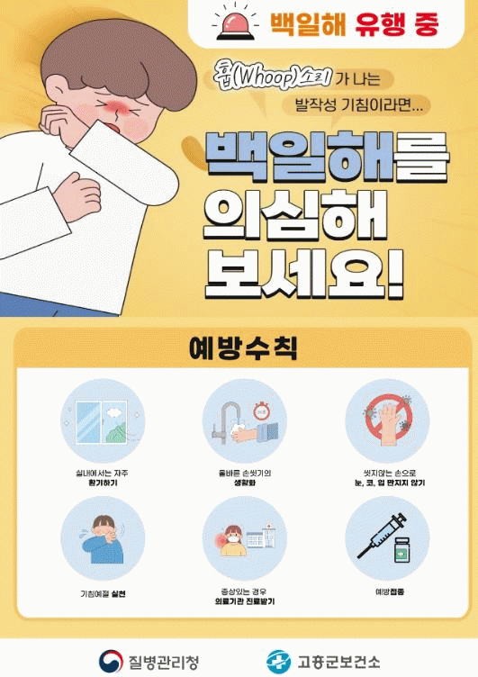¹éÀÏÇØ´Â 2±Þ °¨¿°º´À¸·Î °¡º¿î ±âħ, °¡·¡, Ä๰·Î ½ÃÀÛÇØ ¼ûÀ» µéÀ̽¯ ¶§ ¤¾¤Ì¤²(whoop) ¼Ò¸®°¡ ³ª´Â Ư¡ÀÌ ÀÖÀ¸¸ç, ¿¹¹æ¼öÄ¢À¸·Î´Â ¿¹¹æÁ¢Á¾(ÃÑ 6ȸ) ¹Þ±â, È帣´Â ¹°¿¡ 30ÃÊ ÀÌ»ó ¼Õ ¾Ä±â, ±âħÇÒ ¶§ ÈÞÁö³ª ¿Ê¼Ò¸Å·Î ÀÔ°ú ÄÚ °¡¸®±â, ¾ÄÁö ¾ÊÀº ¼ÕÀ¸·Î ´«¡¤ÄÚ¡¤ÀÔ ¸¸ÁöÁö ¾Ê±â, ±âħ Áõ»óÀÌ ÀÖÀ¸¸é ÀÇ·á±â°ü Áø·á¹Þ±â µîÀÌ ÀÖ´Ù.
