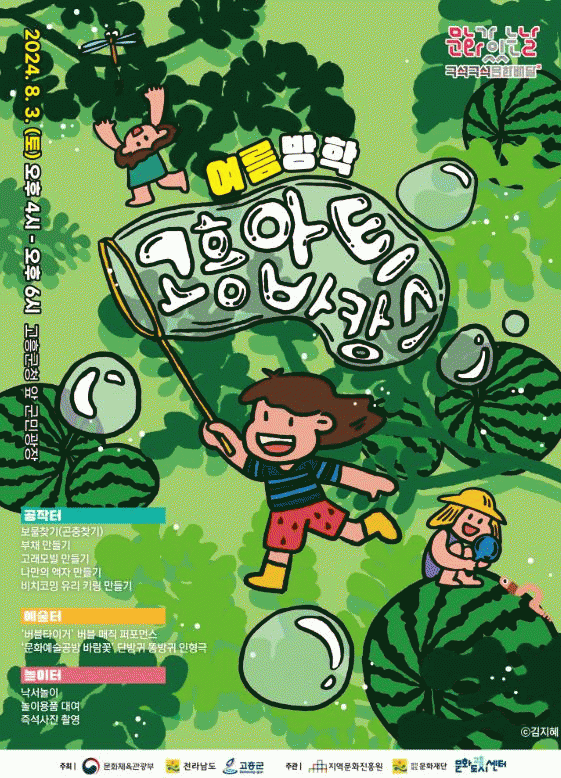 Áö³ 6¿ù 29ÀÏ ¿¸° ¡®°íÈï¾ÆÆ®¹ÙIJ½º-¿µ¿õ¡¯Àº È£±¹º¸ÈÆÀÇ ´ÞÀ» ¸ÂÀÌÇØ ³ª¶ó¸¦ À§ÇØ Èñ»ýÇÏ´Â Á÷¾÷±ºÀ» À§ÇÑ °¨µ¿ÀûÀÎ Çà»ç¿´´Ù¸é, À̹ø 8¿ù 3ÀÏ °íÈï ±º¹Î±¤Àå¿¡¼ ÆîÃÄÁú ¼¼ ¹øÂ° °íÈï¾ÆÆ®¹ÙIJ½º´Â ¡®¿©¸§¹æÇС¯À» ÁÖÁ¦·Î ¾î¸°À̸¦ ´ë»óÀ¸·Î ½Å³ª°í Àç¹ÌÀÖ´Â ¹®È¿¹¼ú ÇÁ·Î±×·¥À» ¸¶·ÃÇÑ´Ù.