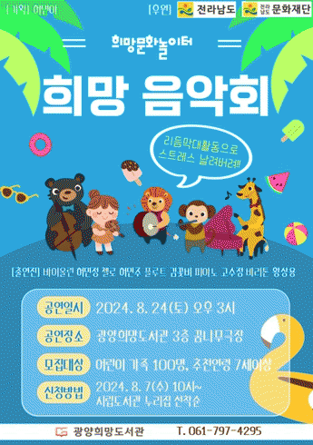 ¡®Èñ¸Á¹®È³îÀÌÅÍ¡¯´Â ¸Å¿ù ¾î¸° Àڳฦ µÐ °¡Á·¿¡°Ô ¹®È ¿¹¼ú°ø¿¬À» Á¦°øÇϰí ÀÖ´Â ±¤¾çÈñ¸Áµµ¼°üÀÇ Æ¯È ÇÁ·Î±×·¥À¸·Î, ÀÌ´Þ ¿¸®´Â °ø¿¬Àº ¿©¸§À» ¸Â¾Æ ´õ ¸¹Àº °¡Á·ÀÌ Âü¿©ÇÒ ¼ö ÀÖµµ·Ï Åä¿äÀÏ¿¡ °³ÃÖÇÑ´Ù.
