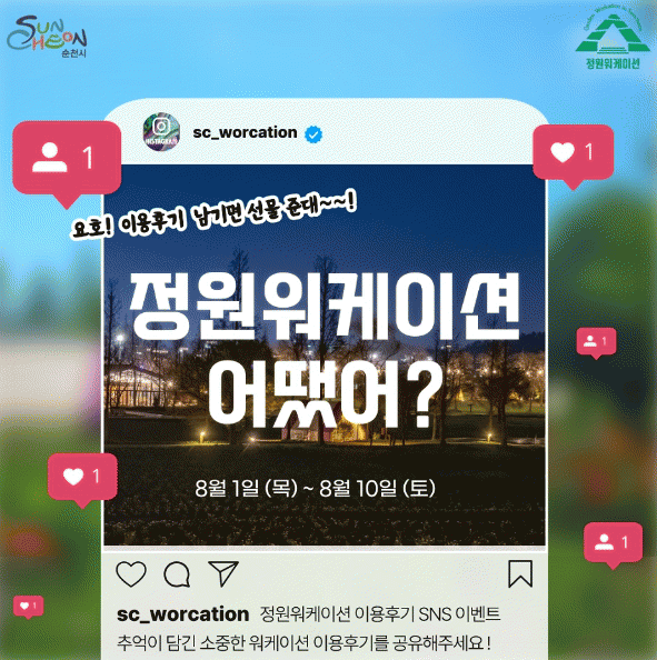 À̺¥Æ®´Â 4¿ùºÎÅÍ 7¿ù±îÁö Á¤¿ø¿öÄÉÀÌ¼Ç ¼÷¹Ú°´À» ´ë»óÀ¸·Î 8¿ù 11ÀϱîÁö ÁøÇàÇϸç, Âü¿©¹æ¹ýÀº ¸ÕÀú º»ÀÎÀÇ SNS °èÁ¤¿¡ ÀÌ¿ë Èı⸦ ÀÛ¼ºÇϰí, ±¸±ÛÆû ¾ç½Ä¿¡ ¸Â°Ô ¼ÒÁ¤ÀÇ Á¤º¸¸¦ ÀÛ¼ºÇÑ ´ÙÀ½ Á¦ÃâÇÏ¸é µÈ´Ù.