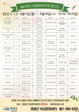 ±³À° ±â°£Àº 9¿ùºÎÅÍ 12¿ù±îÁö ¿î¿µµÇ¸ç °ú¸ñº° ¼ö¾÷½Ã°£ ¹× ¼ö¾÷³»¿ëÀº ¿µ±¤±º ´©¸®Áý(ȨÆäÀÌÁö) °Ô½ÃÆÇÀ» ÅëÇØ È®ÀÎÇÒ ¼ö ÀÖ´Ù. ±âŸ ÀÚ¼¼ÇÑ »çÇ×Àº ¿©¼º¹®È¼¾ÅÍ ¶Ç´Â ¿µ±¤±º °¡Á¤Çູ°ú·Î ¹®ÀÇÇÏ¸é µÈ´Ù.