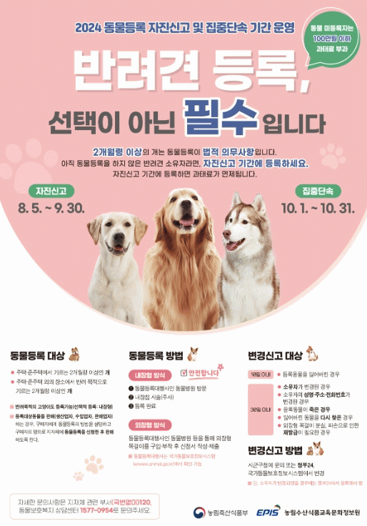 ¼º¼÷ÇÑ ¹Ý·Áµ¿¹° ¹®È Á¶¼º Ä·ÆäÀÎÀÇ ÀÏȯÀ¸·Î ½ÃÇàÇÏ´Â ÀÚÁø½Å°í´Â ±â°£ ³»¿¡ ½Å±Ô·Î µ¿¹°À» µî·ÏÇϰųª ±âÁ¸¿¡ µî·ÏµÈ Á¤º¸¸¦ º¯°æ ½Å°íÇÏ¸é ¹Ìµî·ÏÀ̳ª Áö¿¬¿¡ µû¸¥ °úÅ·ᰡ ¸éÁ¦µÈ´Ù.
