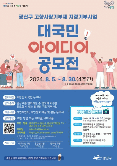 ±¤»ê±¸´Â ¾ÆÀ̵ð¾î °ø¸ðÀü Âü¿©ÀÚ Áß ±¤»ê±¸¿¡ 10¸¸ ¿ø ÀÌ»ó °íÇâ»ç¶û±âºÎ¸¦ ÇÑ ¼±Âø¼ø 50¸í¿¡°Ô 1¸¸ ¿ø »ó´çÀÇ ±âÇÁƼÄÜÀ» Áö±ÞÇÏ´Â ¡®±âºÎ ÀÎÁõ À̺¥Æ®¡¯µµ ÁøÇàÇÑ´Ù.