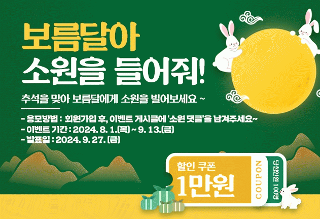 ¸ÕÀú, Ãß¼®¸ÂÀÌ¡®º¸¸§´Þ¾Æ ¼Ò¿øÀ» µé¾îÁà!¡¯´ñ±Û À̺¥Æ®¸¦ ÁøÇàÇÑ´Ù. À̹ø À̺¥Æ®´Â °î¼º¸ô¿¡ °¡ÀÔÇÑ µÚ Ãß¼® ¼Ò¿øÀ» ´ñ±Û·Î ³²±â¸é Ãß÷À» ÅëÇØ À̺¥Æ® Âü¿©ÀÚ Áß 100¸íÀ» ¼±Á¤, °î¼º¸ô 1¸¸ ¿ø ÄíÆùÀ» Á¦°øÇÑ´Ù. ¿À´Â 9¿ù 13ÀϱîÁö ÁøÇàµÇ¸ç, 9¿ù 27ÀÏ Ãß÷À» ÅëÇØ °³º° ¾È³»ÇÒ ¿¹Á¤ÀÌ´Ù.