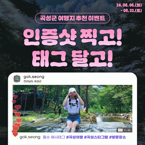 ¿À´Â 8¿ù 31ÀϱîÁö °î¼ºÀ» ¹æ¹®ÇÑ ÇǼ°´µéÀº ´©±¸³ª º» À̺¥Æ®¿¡ Âü¿©°¡ °¡´ÉÇϰí, °î¼º¿¡¼ ÈÞ°¡¸¦ º¸³½ ÀÎÁõ¼¦°ú °î¼º ¿©Çà °ü·Ã ÇØ½Ãű׸¦ °³ÀÎ SNS¿¡ ¾÷·ÎµåÇÏ¸é µÈ´Ù. 9¿ù 6ÀÏ Ãß÷À» ÅëÇØ 33¸íÀ» »Ì¾Æ ¸ð¹ÙÀÏ ±âÇÁƼÄÜÀ» Á¦°øÇÑ´Ù.