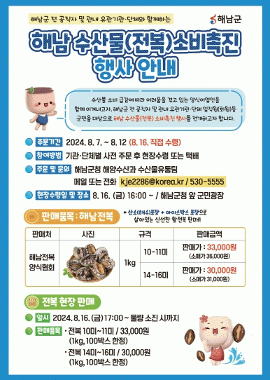 ÇöÀå¹èºÎ Çà»ç¿¡¼´Â »çÀüÁÖ¹®°ú º°°³·Î 200¹Ú½º ÇÑÁ¤À¸·Î Àüº¹ ÇÒÀÎÆÇ¸Åµµ ½Ç½ÃÇÑ´Ù. ÇØ³²±º Àüº¹¾ç½ÄÇùȸ ¼Ò¼Ó ¾ç½Ä ¾î¾÷ÀεéÀÌ Á÷Á¢ »ý»êÇÑ ½Ì½ÌÇÑ Àüº¹À» ÇÒÀÎµÈ °¡°ÝÀÎ 1kg ±âÁØ, 10~11¹Ì 3¸¸3000¿ø, 14~16¹Ì¸¦ 3¸¸¿ø¿¡ ±¸ÀÔÇÒ ¼ö ÀÖ´Ù.