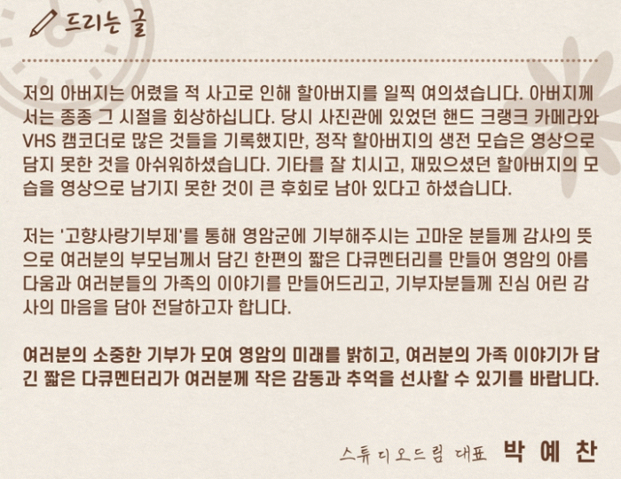 ¹Ú ´ëÇ¥´Â ¡°°íÇâ»ç¶û±âºÎÀÚ °¡Á·¿¡°Ô ¿µ¿øÇÑ Ãß¾ïÀ¸·Î ³²À» À̾߱⸦ ´ã¾Æ ÀüÇÏ°í ½Í´Ù. ¶æ ±íÀº ±âºÎ¿¡ ÀÇ¹Ì ÀÖ´Â ¼±¹°·Î °¨µ¿À» ÀüÇÏ·Á°í ºÎ¸ð´Ô »ýȰ ¿µ»óÀ» ±âȹÇß´Ù¡±°í ¹àÇû´Ù.