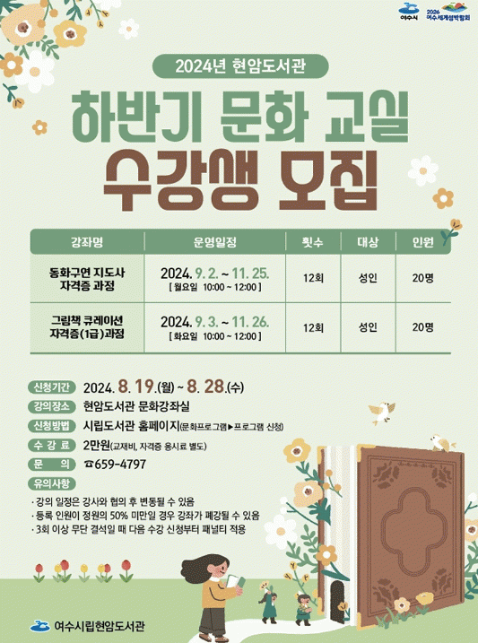 °³¼³°Á´ ¡ãµ¿È±¸¿¬ Áöµµ»ç ÀÚ°ÝÁõ °úÁ¤ ¡ã±×¸²Ã¥ Å¥·¹ÀÌ¼Ç ÀÚ°ÝÁõ(1±Þ) °úÁ¤ µî 2°³ °Á·Î, ¿À´Â 9¿ù 2ÀϺÎÅÍ 11¿ù 26ÀϱîÁö °¢°¢ 12ȸ ÁøÇàµÈ´Ù.