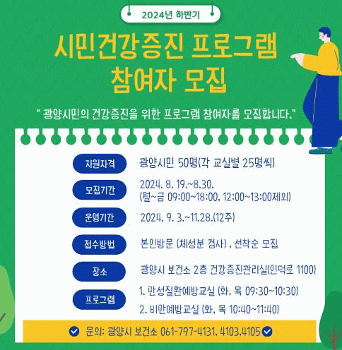 ÇØ´ç ÇÁ·Î±×·¥Àº ü·Â°È, ºñ¸¸ ¿¹¹æ, ±Ù·Â°ú À¯¿¬¼º °È¿¡ ÁÁÀº ºñ±³Àû °í°µµ ¿îµ¿À¸·Î ÁøÇàÇÒ ¿¹Á¤ÀÌ´Ù.