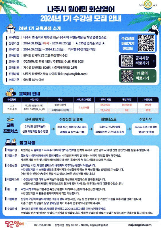 ÇкθðµéÀÇ »ç±³À°ºñ ºÎ´ãÀ» ÁÙÀ̰í Áö¿ª ±³À° °æÀï·ÂÀ» °ÈÇϱâ À§ÇØ ÃßÁøÇÏ´Â È»ó¿µ¾î ±³À°¿¡ Âü¿©Çϸé Àú·ÅÇÑ °¡°ÝÀ¸·Î ¿ø¾î¹Î¿¡°Ô ¿µ¾î¸¦ ¹è¿ï ¼ö ÀÖ°Ô µÈ´Ù.