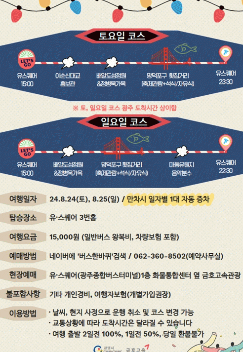 Âü¿©¸¦ ¿øÇÏ´Â »ç¶÷Àº ³²µµÇѹÙÄû ȨÆäÀÌÁö ½ÃƼÅõ¾î ÄÚ³Ê ¡®±¤¾ç¿©Çà °¡´Â ³¯¡¯¿¡¼ Á¢¼öÇϰųª À¯¼± ÀüÈ(¢Ï062-360-8502)·Î »çÀü ¿¹¾àÀÌ °¡´ÉÇÏ´Ù. ÀÌ¿ë¿ä±ÝÀº 1¸¸5õ ¿øÀÌ¸ç ½Äºñ, ÀÔÀå·á, ¿©ÇàÀÚº¸Çè µîÀº Æ÷ÇÔµÇÁö ¾ÊÀº °¡°ÝÀÌ´Ù.