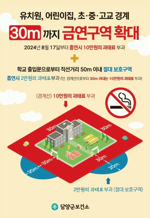 ±¹¹Î°Ç°ÁõÁø¹ý Á¦9Á¶ Á¦6Ç×ÀÌ °³Á¤µÊ¿¡ µû¶ó ¾î¸°ÀÌÁý¡¤À¯Ä¡¿ø ½Ã¼³ °æ°è¼±À¸·ÎºÎÅÍ ±âÁ¸ 10m À̳»¿¡¼ 30m À̳»·Î È®´ëµÇ¸ç, ÃÊ¡¤Áß¡¤°íµîÇб³ ½Ã¼³ °æ°è¼±À¸·ÎºÎÅÍ 30m À̳»°¡ ±Ý¿¬ ±¸¿ªÀ¸·Î ½Å±Ô ÁöÁ¤µÆ´Ù. ÀÌ¿¡ µû¶ó ÇØ´ç ±Ý¿¬ ±¸¿ª¿¡¼ Èí¿¬ ÇàÀ§ Àû¹ß ½Ã °úÅ·á 10¸¸ ¿øÀÌ ºÎ°úµÈ´Ù.