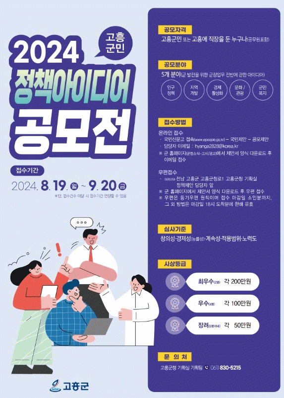 °ø¸ðÀü¿¡ ´ëÇÑ ÀÚ¼¼ÇÑ ³»¿ëÀº °íÈﱺ ´ëÇ¥ ´©¸®Áý(ȨÆäÀÌÁö)À» Âü°íÇϰųª, °íÈﱺû ±âȹ½Ç ±âȹÆÀ(¢Ï061-830-5215)À¸·Î ¹®ÀÇÇÏ¸é µÈ´Ù.