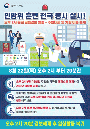 22ÀÏ ¿ÀÈÄ 2½Ã °ø½À°æº¸ »çÀÌ·»ÀÌ ¿ï¸®¸é ¸ðµç ÁÖ¹ÎÀº °¡±î¿î ¹Î¹æÀ§ ´ëÇǼҳª ÁöÇϰø°£À¸·Î ´ëÇÇÇÏ¿©, ¶óµð¿À ¹æ¼Û(FM 105.9MHz)¿¡¼ ³ª¿À´Â ±¹¹ÎÇൿ¿ä·ÉÀ» µû¶ó Çàµ¿ÇØ¾ß ÇÑ´Ù.