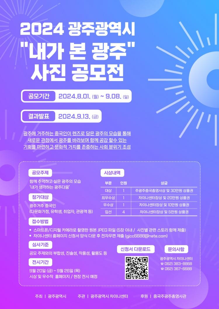 ³»°¡ Ãß¾ïÇÏ´Â ±¤ÁÖ´Ù¿ò, Ư»ö ÀÖ´Â ±¤ÁÖÀÇ ¸ð½À, ±¤ÁÖ ÃàÁ¦ ÇöÀå, Ȱ±âÂù ´ëÇÐ »ýȰ Ä·ÆÛ½º µî ±¤ÁÖ¿Í °ü·ÃÇÑ ¸ðµç ÀÚÀ¯ ÁÖÁ¦·Î Âü¿© °¡´ÉÇÑ À̹ø °ø¸ðÀüÀº ±¤ÁÖ °ÅÁÖ Áß±¹ÀÎ(´Ù¹®È°¡Á¤, À¯Çлý, ±Ù·ÎÀÚ µî)À̶ó¸é ´©±¸³ª Âü¿© °¡´ÉÇÏ¸ç °¢ ºÎ¹®º°·Î ´ë»ó(Áß±¹ÁÖ±¤ÁÖÃÑ¿µ»ç°ü), ÃÖ¿ì¼ö»ó, ¿ì¼ö»ó, ÀÔ¼±(ÀÌ»ó ±¤ÁÖ±¤¿ª½Ã Â÷À̳ª¼¾ÅÍÀå»ó)ÀÌ ¼ö¿©µÈ´Ù.