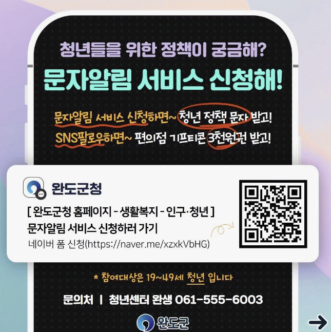 ¹®ÀÚ ¾Ë¸² ¼ºñ½º´Â Àü±¹ÀÇ 19~49¼¼ û³âµéÀ» ´ë»óÀ¸·Î Çϸç, ½ÅûÀº ¿Ïµµ±º ´©¸®Áý-»ýȰ º¹Áö-Àα¸ û³â-¹®ÀÚ ¾Ë¸² ¼ºñ½º â¿¡¼ ÇÏ¸é µÈ´Ù.