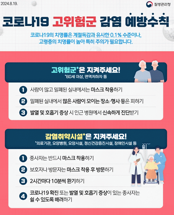 ¶ÇÇÑ Äڷγª19 °íÀ§Ç豺ÀÌ ¸¹ÀÌ ÀÌ¿ëÇÏ´Â ÀÇ·á±â°ü°ú °¨¿°Ãë¾à½Ã¼³(¿ä¾çº´¿ø, ¿ä¾ç½Ã¼³, Á¤½Å°Ç°ÁõÁø½Ã¼³, Àå¾ÖÀνü³ µî)¿¡ ´ëÇØ¼µµ ¡ã Á¾»çÀÚ, º¸È£ÀÚ, ¹æ¹®ÀÚÀÇ ¸¶½ºÅ© Âø¿ë ¡ã 2½Ã°£¸¶´Ù 10ºÐ¾¿ ȯ±â ¡ãÄڷγª19 È®Áø ¶Ç´Â ¹ß¿ ¹× È£Èí±â Áõ»óÀÌ ÀÖ´Â Á¾»çÀÚÀÇ ÈÞ½ÄÀ» ¹è·ÁÇØÁÙ °ÍÀ» ±Ç°íÇß´Ù.