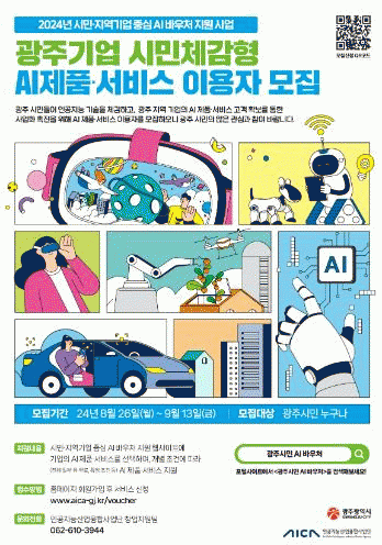±¤ÁÖ±¤¿ª½Ã´Â ÀΰøÁö´É(AI) ±â¼úÀ» Á÷Á¢ üÇèÇϰí Áö¿ª±â¾÷ÀÇ ¼ºÀåÀ» ÃËÁøÇϱâ À§ÇØ ¡®½Ã¹Î¡¤Áö¿ª±â¾÷ Á᫐ ÀΰøÁö´É(AI) ¹Ù¿ìó Áö¿ø »ç¾÷¡¯¿¡ Âü¿©ÇÒ ½Ã¹Î ÀÌ¿ëÀÚ¸¦ 26ÀϺÎÅÍ 9¿ù13ÀϱîÁö ¸ðÁýÇÑ´Ù.