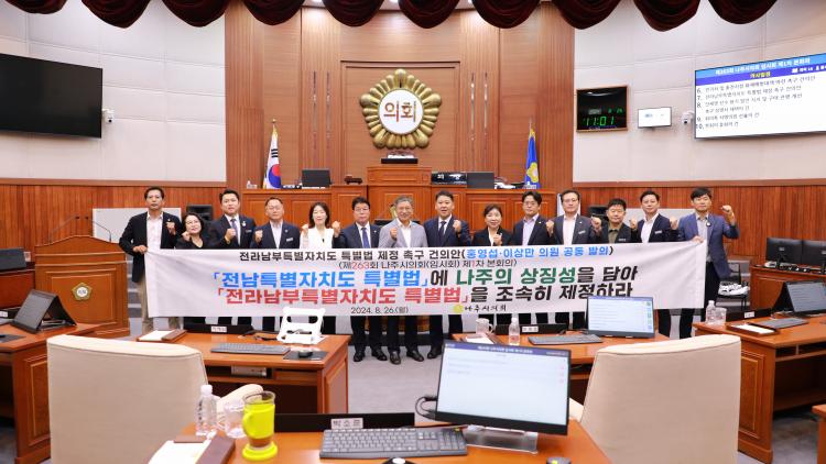 °ÇÀǾÈÀ» °øµ¿ ¹ßÀÇÇÑ È«¿µ¼·¡¤ÀÌ»ó¸¸ ÀÇ¿øÀº ¡°2024³â 6¿ù 11ÀÏ Áö¹æ¼Ò¸ê À§±â ±Øº¹À» À§ÇÑ Àü³²Æ¯º°ÀÚÄ¡µµ ¼³Ä¡ µî¿¡ °üÇÑ Æ¯º°¹ý¾ÈÀÌ ¹ßÀǵǾúÀ¸³ª ³ªÁÖ¿Í Àü¶óµµÀÇ ¿ª»çÀû »ó¡¼ºÀ» Æ÷ÇÔÇÏÁö ¾ÊÀº À̸§À¸·Î ³ªÁÖ¿Í Àü¶ó³²µµÀÇ ¿ª»çÀû Á¤Ã¼¼ºÀÌ ÈÑ¼ÕµÉ±î ¿ì·ÁµÈ´Ù¡±¸ç Àü¶ó³²ºÎƯº°ÀÚÄ¡µµ Ưº°¹ý Á¦Á¤À» Ã˱¸ °ÇÀÇÇß´Ù.