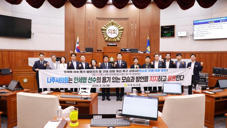 ¸¶Áö¸·À¸·Î ³ªÁÖ½ÃÀÇȸ ÀÇ¿ø 16¸íÀº Çϳª µÈ ¸ñ¼Ò¸®·Î ¾È¼¼¿µ ¼±¼öÀÇ ¿ë±â ÀÖ´Â ¸ð½À°ú ¹ß¾ðÀ» ÁöÁöÇÏ¸ç ´ÙÀ½°ú °°ÀÌ ÀÔÀåÀ» Ç¥¸íÇß´Ù.