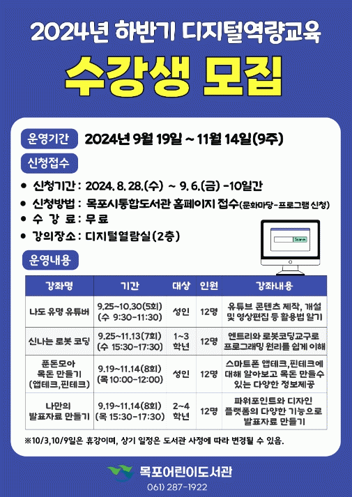 µðÁöÅпª·®±³À°Àº ¡ã½Å³ª´Â ·Îº¿ÄÚµù(1~3Çгâ)¡ã³ª¸¸ÀÇ ¹ßÇ¥ÀÚ·á ¸¸µé±â(2 ºÎÅÍ 4Çгâ) ¡ãǬµ·¸ð¾Æ ¸ñµ· ¸¸µé±â(¼ºÀÎ) ¡ã³ªµµ À¯¸í À¯Æ©¹ö(¼ºÀÎ)µî 4°³°Á·Π11¿ù 14ÀϱîÁö ¹«·á·Î ¿î¿µÇÑ´Ù.
