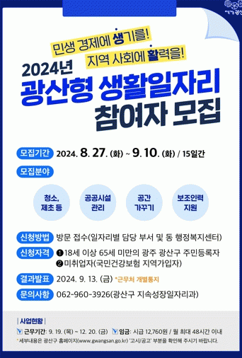±¤»êÇü »ýȰÀÏÀÚ¸®´Â ±¤ÁÖ ÃÖÃÊ·Î 5¾ï ¿øÀÇ ¿¹»êÀ» Æí¼ºÇØ Áö¿ªÁֹο¡°Ô ÀÏÀÚ¸®¸¦ Á¦°øÇϰí Âü¿©ÀÚÀÇ ¼Òµæ º¸Àü, ¼ÒºñȰµ¿ ÃËÁø µî ¹Î»ý °æÁ¦¿¡ Ȱ·ÂÀ» µµ¸ðÇϰíÀÚ ¸¶·ÃÇß´Ù.
