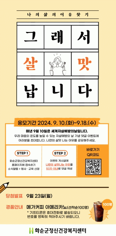 ¶ÇÇÑ, Àڻ쿹¹æÀÇ ³¯ÀÎ 9¿ù 10ÀÏ(È)ºÎÅÍ Ãß¼® ¿¬ÈÞÀÎ 18ÀÏ ¼ö¿äÀÏ ±îÁö´Â ȼø±ºÁ¤½Å°Ç°º¹Áö¼¾ÅÍ È¨ÆäÀÌÁö¿¡¼ ³ªÀÇ »îÀÇ ÀÌÀ¯ ã±â·Î ¡°±×·¡¼ »ì¸À ³³´Ï´Ù¡± ´ñ±Û À̺¥Æ®°¡ À̾îÁø´Ù.