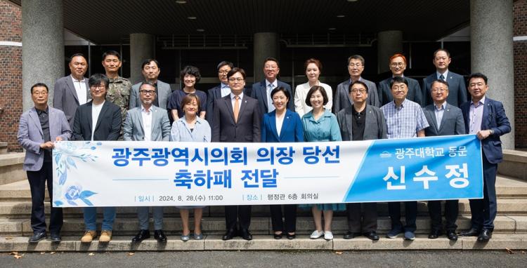 [ÅåÅå´º½º]±¤ÁÖ´ëÇб³(ÃÑÀå ±èµ¿Áø)´Â ±¤ÁÖ±¤¿ª½ÃÀÇȸ °³¿ø 34³â ¸¸¿¡ ÃÖÃÊ·Î ¿©¼º ÀÇÀåÀ¸·Î ´ç¼±µÅ Á¦9´ë ÈĹݱâ ÀÇȸ¸¦ À̲ø°í ÀÖ´Â ÀÚ¶û½º·¯¿î µ¿¹® ½Å¼öÁ¤ ÀÇÀå(»ê¾÷µðÀÚÀÎÇаú 96³â Á¹¾÷)¿¡°Ô ÃàÇÏÆÐ¸¦ Àü´ÞÇß´Ù.