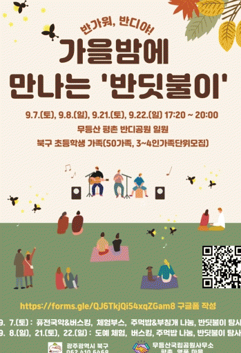 ¸ÕÀú °¡À»¹ã¿¡ ¸¸³ª´Â ¹Ýµ÷ºÒÀÌ Çà»ç´Â 9¿ù 7ÀÏ 1ȸÂ÷¸¦ ½ÃÀÛÀ¸·Î 8ÀÏ, 21ÀÏ, 22ÀÏ¿¡ ÆòÃ̵µ¿¹°ø¹æ°ú Æò¹«¶ã ÀÏ¿ø¿¡¼ ÃÑ 4ȸ ¿î¿µµÇ¸ç ´çÀÏ Çà»çÀå¿¡¼´Â ¹ö½ºÅ· °ø¿¬, ȯ°æ ºÐ¾ß ÄûÁî Ç®ÀÌ, ¹Ýµ÷ºÒÀÌ Å½»ç µî ȯ°æÀÇ ¼ÒÁßÇÔ°ú ¹Ýµ÷ºÒÀÌÀÇ ½Åºñ·Î¿î ºûÀ» üÇèÇÒ ¼ö ÀÖ´Â ´Ùä·Î¿î ÇÁ·Î±×·¥ÀÌ ¿ÀÈÄ 6½ÃºÎÅÍ 8½Ã±îÁö ¿¸°´Ù.