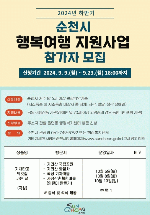 ¡®¼øÃµ½Ã Çູ¿©Çà Áö¿ø»ç¾÷¡¯ Âü°¡ÀÚ ¸ðÁý¿¡ °üÇÑ ±âŸ ÀÚ¼¼ÇÑ »çÇ×Àº ¼øÃµ½Ã ´©¸®Áý °ø°í¹®À» È®ÀÎÇϰųª ¼øÃµ½Ã °ü±¤°ú ¹× ÇàÁ¤º¹Áö¼¾ÅÍ·Î ¹®ÀÇÇÏ¸é ¾È³»¹ÞÀ» ¼ö ÀÖ´Ù.
