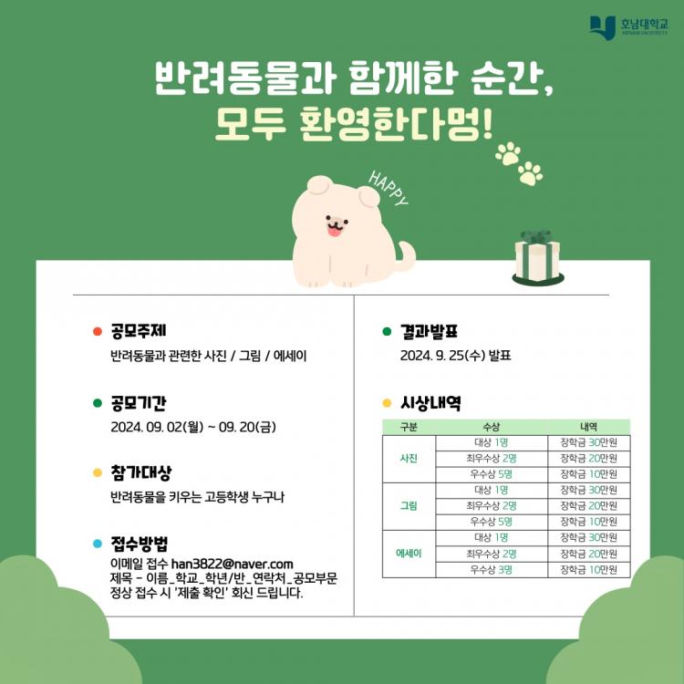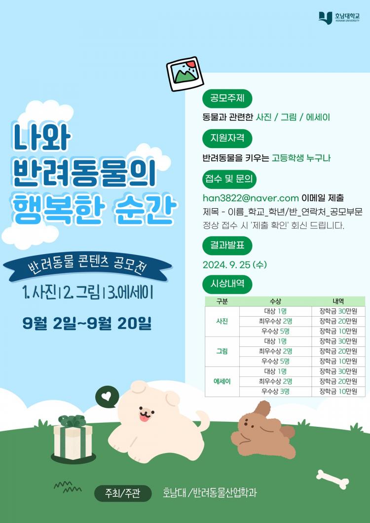 [ÅåÅå´º½º]È£³²´ëÇб³ ¹Ý·Áµ¿¹°»ê¾÷Çаú(ÇаúÀå À̹®¿µ)´Â 9¿ù 2ÀϺÎÅÍ 9¿ù 20ÀϱîÁö '³ª¿Í ¹Ý·Áµ¿¹°ÀÇ ÇູÇÑ ¼ø°£'À» ÁÖÁ¦·Î ÇÑ ¹Ý·Áµ¿¹° ÄÜÅÙÃ÷ °ø¸ðÀüÀ» °³ÃÖÇÑ´Ù. À̹ø °ø¸ðÀüÀº »çÁø, ±×¸², ¿¡¼¼ÀÌ ¼¼ ºÎ¹®À¸·Î ³ª´² ÁøÇàµÇ¸ç, ¹Ý·Áµ¿¹°À» »ç¶ûÇÏ´Â °íµîÇлýÀ̶ó¸é ´©±¸³ª Âü¿©ÇÒ ¼ö ÀÖ´Ù.