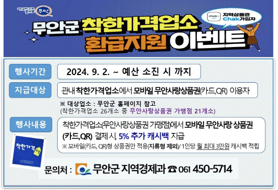 ÇöÀç ¹«¾È±ºÀº ¡®ÂøÇѰ¡°Ý¾÷¼Ò¡¯¸¦ 26°³¼Ò ÁöÁ¤ ¿î¿µÇÏ¿© ¹°°¡ ¾ÈÁ¤¿¡ ³ª¼°í ÀÖÀ¸¸ç ÀÌÁß ¹«¾È»ç¶û»óǰ±Ç °¡¸ÍÁ¡Àº 21°³¼Ò·Î Ãß°¡ÇÒÀÎ ÇýÅÃÀ» Á¦°ø¹ÞÀ» ¼ö ÀÖ´Ù. ÂøÇѰ¡°Ý¾÷¼Ò ÇöȲÀº ¹«¾È±º ȨÆäÀÌÁö °øÁö»çÇ׿¡¼ È®ÀÎÇÏ¸é µÈ´Ù.