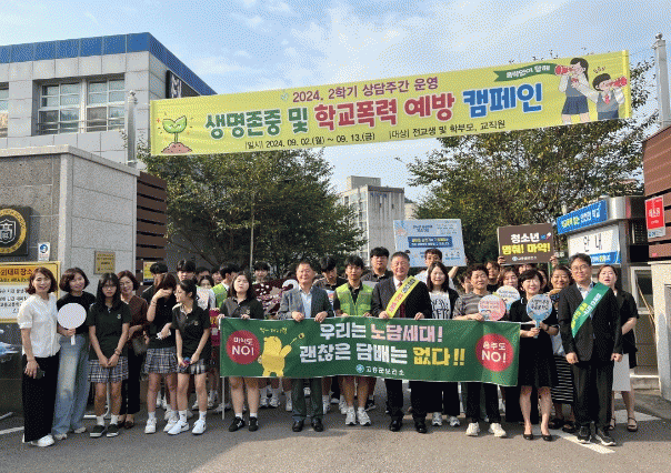 Ä·ÆäÀο¡¼´Â Çб³ Á¤¹® ¾Õ¿¡¼ ÇÇÄϰú Çö¼ö¸·À» µé°í ¡®¿ì¸®´Â ³ë´ã¼¼´ë! ±¦ÂúÀº ´ã¹è´Â ¾ø´Ù! ´Â ½½·Î°ÇÀ» ¿ÜÃÆÀ¸¸ç, ½½·Î°ÇÀÌ ÀûÈù È«º¸ ¹°Ç°À» ³ª´²ÁÖ¸ç Èí¿¬ ¿¹¹æÀÇ Á߿伺À» ¾Ë·È´Ù.