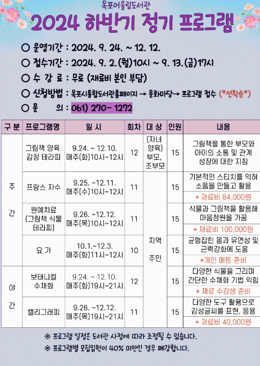 À̹ø ÇϹݱâ Á¤±âÇÁ·Î±×·¥Àº ¡ã±×¸²Ã¥ ¾çÀ° °¨Á¤ Ä¡·á(ÁÖ°£) ¡ã¿ø¿¹ Ä¡·á(ÁÖ°£) ¡ãÇÁ¶û½º ÀÚ¼ö(ÁÖ°£) ¡ã¿ä°¡(ÁÖ°£) ¡ã½Ä¹°·Î ¸¸µå´Â(º¸Å×´ÏÄÃ) ¼öäÈ(¾ß°£) ¡ã͏®±×·¡ÇÇ(¼Õ ±Û¾¾¸¦ ÀÌ¿ëÇØ ±¸ÇöÇÏ´Â ½Ã°¢ ¿¹¼ú-¾ß°£)·Î ±¸¼ºµÅ ÀÖ´Ù.
